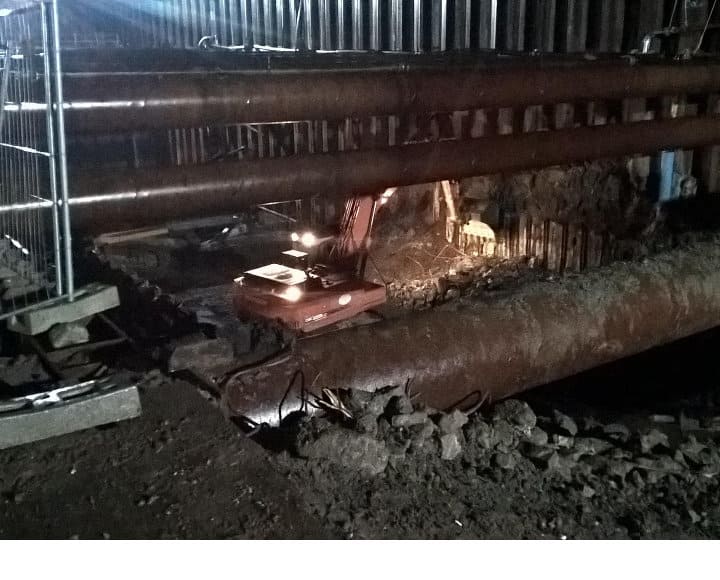 Ca. 1000 m² große Baugrube mit rückverankerter Unterwasserbeton – Sohle. Wasserstand 5,60 m über UK UW-Beton-Sohle. Sohle 1,30 m dick, Pfahlköpfe werden mit der späteren Konstruktionssohle verbunden, um die Auftriebssicherheit im Endzustand auch ohne Pfahlwirkung sichzustellen.